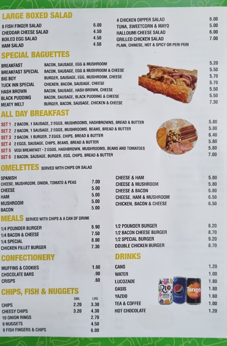 Welcome to The Tuck Inn, a delightful café located at 2 Stepfield in Witham. This hidden gem offers an enticing menu tailored for food lovers. The kebab selection is a highlight, featuring options like Mexican Chicken and Piri Piri Chicken, each priced reasonably at just £7.00. Don’t miss their flavorful omelettes, with choices ranging from Spanish to Chicken, Bacon & Cheese, sure to satisfy your breakfast cravings.